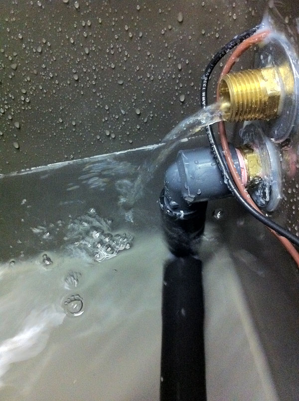 Here is a dry fit of the assembled components: http://dorkiphus.net/porsche/attachm...chmentid=27551 It was then time to drill some holes into a brand new airtight cooler. As you can see, the holes for the wires are very very snug. The holes for the pipe fittings were equally tight and needed to be opened a bit to get the parts through. I measured to ensure there would be enough space for the washers and tried to keep all the connecting points as high as possible. http://dorkiphus.net/porsche/attachm...chmentid=27552 I then did a test fit with everything. http://dorkiphus.net/porsche/attachm...chmentid=27553 http://dorkiphus.net/porsche/attachm...chmentid=27554 Once I was sure everything looked good, I then started the final assembly. I removed and roughed up the insulation on the inside of the pipe holes to allow for the adhesive silicone caulk/sealant to have a place to bond to. The main concern is water running between the washers and getting into the innards of the cooler itself. I then used the thread tape and a pipe wrench and put the 1/2 to 3/8 reducer on the pipe. I installed the 90 degree elbow onto one of them as it would be impossible once it was sealed in place. Important thing I learned: Two inch pipe is too long! I had to use my dremel to remove 1/4" off the length in order for it to be tight enough on the cooler. The better solution is probably to put a few extra washers on the outside... Now I put a bunch of caulk all over the inside of the wholes and the area where the washer would be touching. I also put a little around the pipe before putting the washer on. It was just a matter of wrenching it all down in place. I did not use any caulk on the outside fittings, but did use the pipe thread everywhere. Here is the completed cooler. http://dorkiphus.net/porsche/attachm...chmentid=27548 http://dorkiphus.net/porsche/attachm...chmentid=27549 And here it is running! http://dorkiphus.net/porsche/attachm...chmentid=27555 I'm very happy with the final results. The flow is great and this is with the shirt hanging 4 feet above the cooler. I used the 3/8 inch coupler so I can later remove the barb fitting and install one of the threaded CPC connectors. Here are roughs for the total costs: