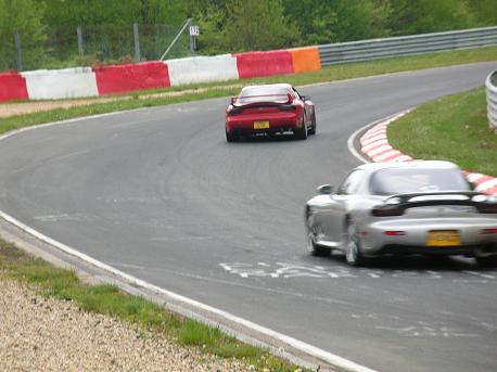 We got to the track at 7:45 and met up with a few of my brother's friends. One of them was there with his GT2 and he promised me a pax lap later that day (unfortunately his gearbox broke before I could catch a ride After a few hot laps with my brother (he has now made 10 trips to the 'Ring and driven 150+ laps not to mention countless pax laps) to get a feel for the track he flipped me the keys for my first driving lap and we were off. All was going well until about the 8 km mark when a red GT3 decided to pass me on the inside of a blind left turn. HELLO ... our mirrors were about 5 inches apart and I thought for a brief second it was all going to be over. I was doing about 120km/hr and fortunately nobody was to my right so I made a quick evasive manuever and he went flying by. I managed to collect myself and continued on. After the lap he came upto us in the parking lot and started screaming at us saying I was on the perfect line blocking him and I had no business being there. He refused to recognize that I DID NOT give him a passing signal (rule of the track is you put your right turn signal on to let someone know you see them and they can pass on the left) but finally walked away in a huff. Welcome to Germany and the wonderful world of GT3's (Note: I'll post my impressions of driving / riding the track in a separate thread) The rest of the morning was much less eventful as I did a few more driving laps but then caught 10+ passenger laps in other cars. By noontime the track was waaaaaaaaaaaaaay too crowded (3 day Holiday weekend) and actually was closed for a little over 2 hours due to various accidents. The locals/regulars all parked their cars as they didn't want to risk any damage. We spent the afternoon sitting outside watching the craziness around us Around 3 we had enough and decided it was time to spectate...