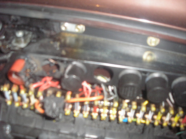 After I pulled over I was on the phone and I noticed smoke coming out of the vents! Popped the hood and saw flames comiing out of the fuse box, I was lucky enough to beat out the fire with my sweater. My brother checked the reisitance of th black wire from the relay and it was .8 ohms so we are thinking the fuel pump heated up frying the fuse/relay. There is also an orange wire that connects fromt the fuel pump fuse terminal to the turn signals and it had an inline fuse that melted into a glob. So I am looking into replacing the fuel pump, two relays/sockets and fuse board. The mess looks worse then it really is from the plastic wire wrap melting, it did not stick to the wires. Sorry for the blurry photo.