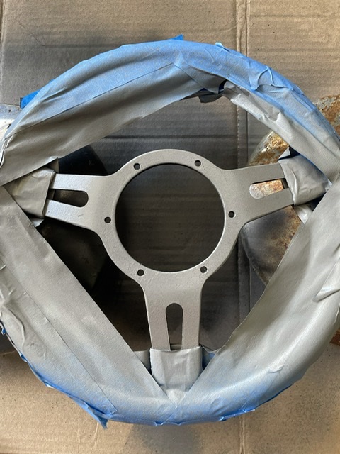 Then we took the body off the pan. Cleaned and primed the pan. And he learned how to use spray paint to attempt and abolish chrome.