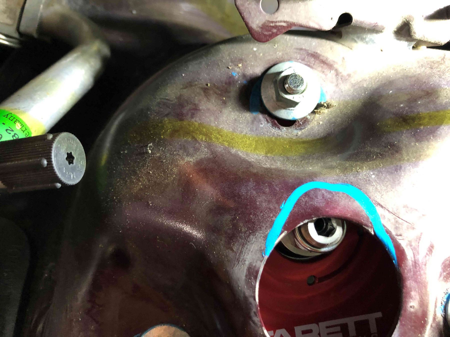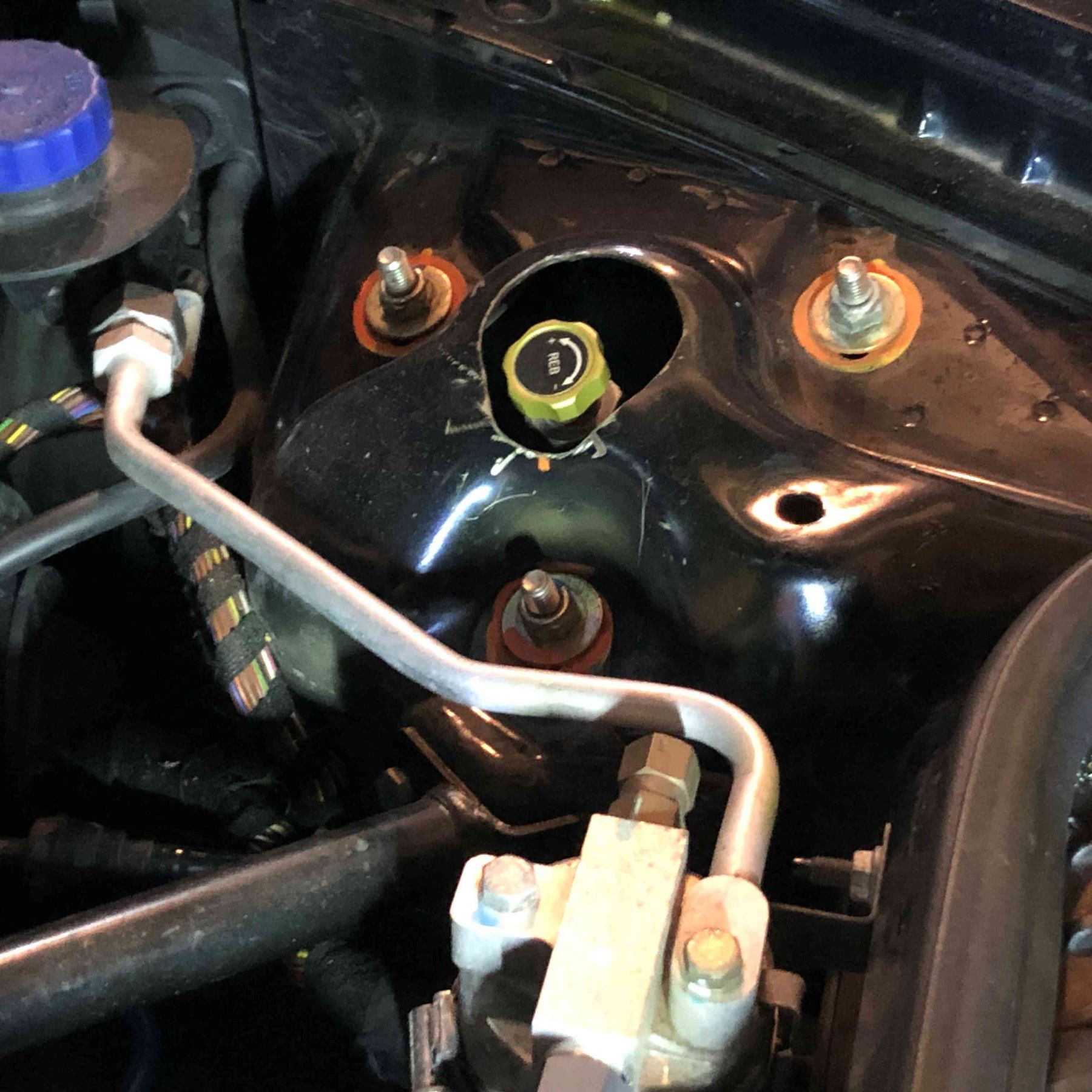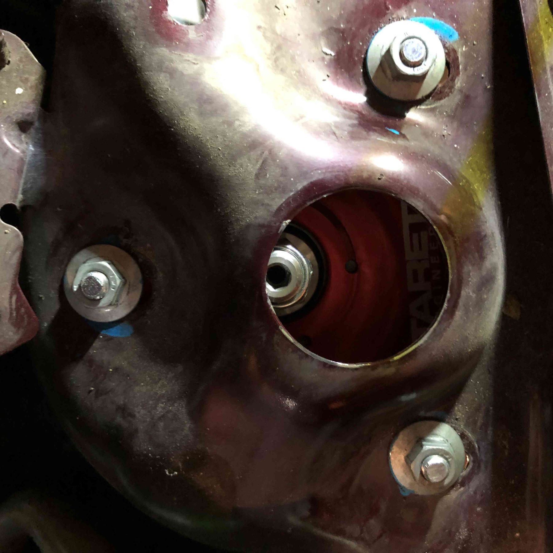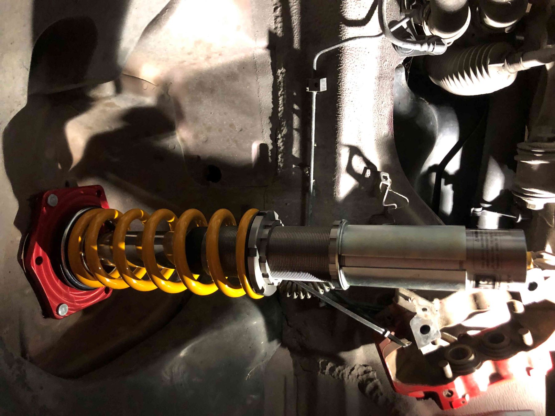 I have moved to the front of the car. I removed both struts. Removing the ball joints and loosening the lower control arm avoided the need for a spring compressor. I hung one of the new struts just to see the fit. The top mount nuts are not fully tight. The shaft is making contact with the body. I looked at the GT3, and it looks like that the body work around the whole where the stock struts fit has been trimmed to get the Motion Control to fit. I think I have to trim the area that I have marked. I will be consulting a professional who may have installed one or two of these before.